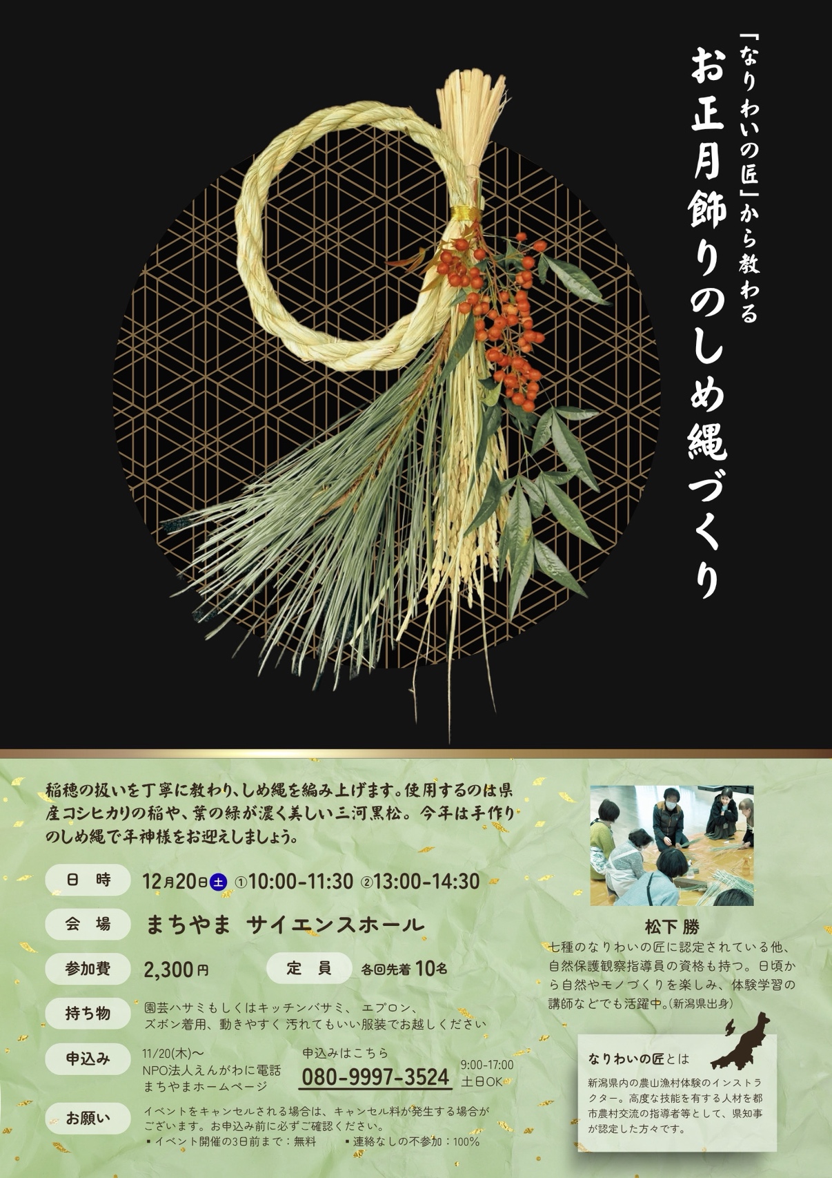 | イベント名 | 「なりわいの匠」から教わる お正月飾りのしめ縄づくり |