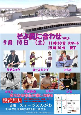 Event ステージえんがわ 2022年9月10日(土) そよ風に合わせVOL.4 昨年に引き続き、ステージえんがわでコンサートを行います。 観覧無料ですので、自由にお立ち寄りください。 イベント名 そよ風に合わせVOL.4 開催日 2022年9月10日(土) 時間 11:30~15:10 会場 ステージえんがわ軒下 参加費 無料 主催 よもぎ 問合せ 090-1439-4257 イベント一覧 トップにもどる 最新のイベント 4月4日(土)、5日(日)、11日(土)、18日(土)、19日(日)、25日(土)、26日(日) 4月エラールピアノ演奏者募集 エラールピアノで開館音楽を奏でる『エラールオープニングベル』 4月に誕生月の方限定で、演奏者を募集します イベントカテゴリー 図書館 科学教育センター 鍛冶ミュージアム ステージえんがわ その他 アーカイブ 2026年4月 2026年3月 2026年2月 2026年1月 2025年12月 2025年11月 2025年10月 2025年9月 2025年8月 2025年7月 2025年6月 2025年5月 2025年4月 2025年3月 2025年2月 2025年1月 2024年12月 2024年11月 2024年10月 2024年9月 2024年8月 2024年7月 2024年6月 2024年5月 2024年4月 2024年3月 2024年2月 2024年1月 2023年12月 2023年11月 2023年10月 2023年9月 2023年8月 2023年7月 2023年6月 2023年5月 2023年4月 2023年3月 2023年2月 2023年1月 2022年12月 2022年11月 2022年10月 2022年9月 2022年8月 2022年7月