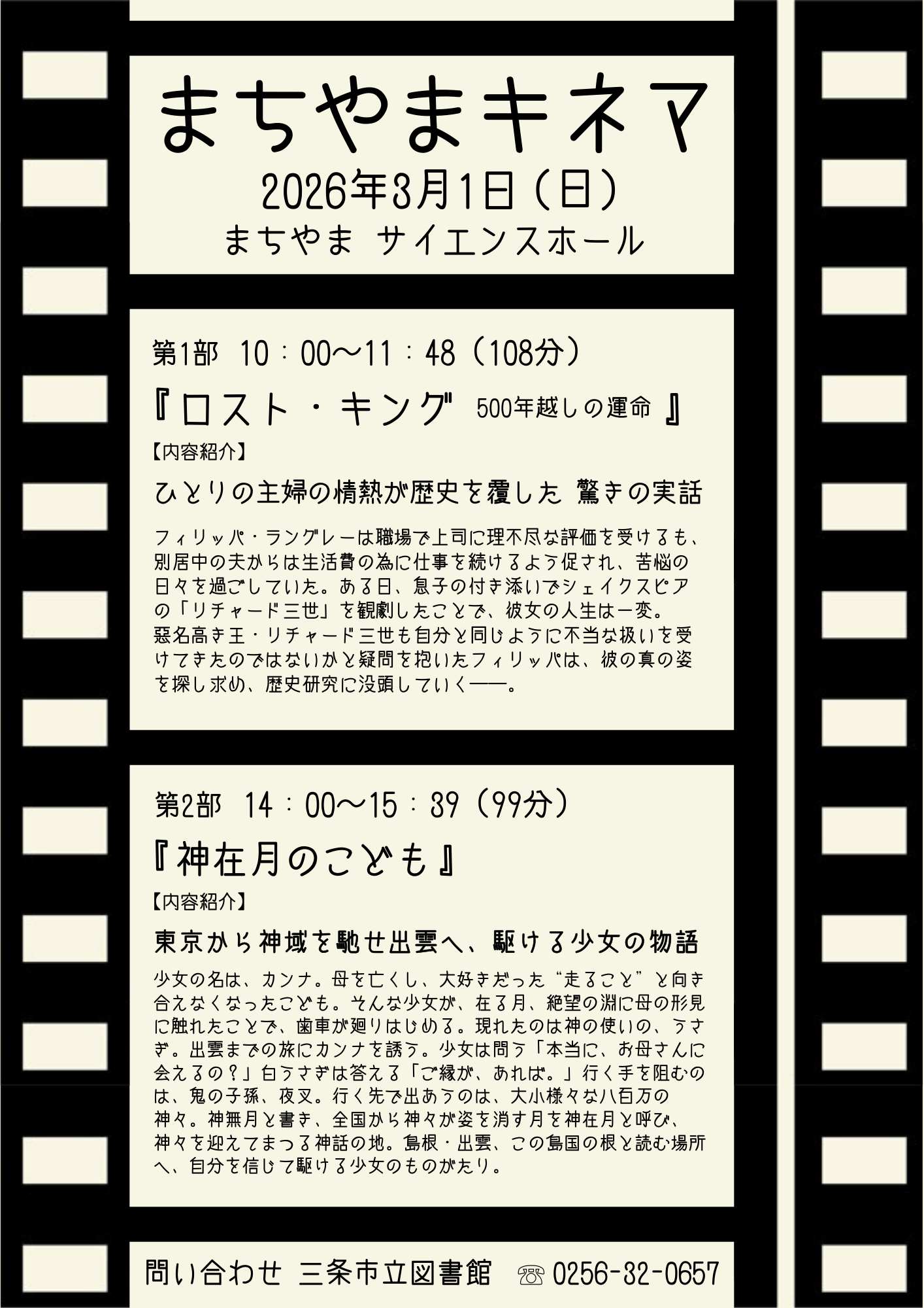 Event 図書館 2026年3月1日(日) まちやまキネマ サイエンスホールの大きなスクリーンで映画を見てみませんか? 【今後の開催予定日】 毎月第1日曜日に開催します。 ※上映作品および時間は、別途お知らせします。 イベント名 まちやまキネマ 開催日 2026年3月1日(日) 時間 【第1部】10:00~11:48 【第2部】14:00~15:39 会場 サイエンスホール 対象 どなたでも 参加費 無料 主催 三条市立図書館 問合せ 三条市立図書館(0256-32-0657) イベント一覧 トップにもどる 最新のイベント 2026年3月1日(日)~4月29日(水・祝) 【募集資格を変更しました】POPコンテスト 作品募集 おすすめの本を紹介する「POPコンテスト」を開催いたします。 ご応募いただいた作品はまちやまで展示し、皆さんから投票いただきます。 投票数の多い作品の イベントカテゴリー 図書館 科学教育センター 鍛冶ミュージアム ステージえんがわ その他 アーカイブ 2026年4月 2026年3月 2026年2月 2026年1月 2025年12月 2025年11月 2025年10月 2025年9月 2025年8月 2025年7月 2025年6月 2025年5月 2025年4月 2025年3月 2025年2月 2025年1月 2024年12月 2024年11月 2024年10月 2024年9月 2024年8月 2024年7月 2024年6月 2024年5月 2024年4月 2024年3月 2024年2月 2024年1月 2023年12月 2023年11月 2023年10月 2023年9月 2023年8月 2023年7月 2023年6月 2023年5月 2023年4月 2023年3月 2023年2月 2023年1月 2022年12月 2022年11月 2022年10月 2022年9月 2022年8月 2022年7月