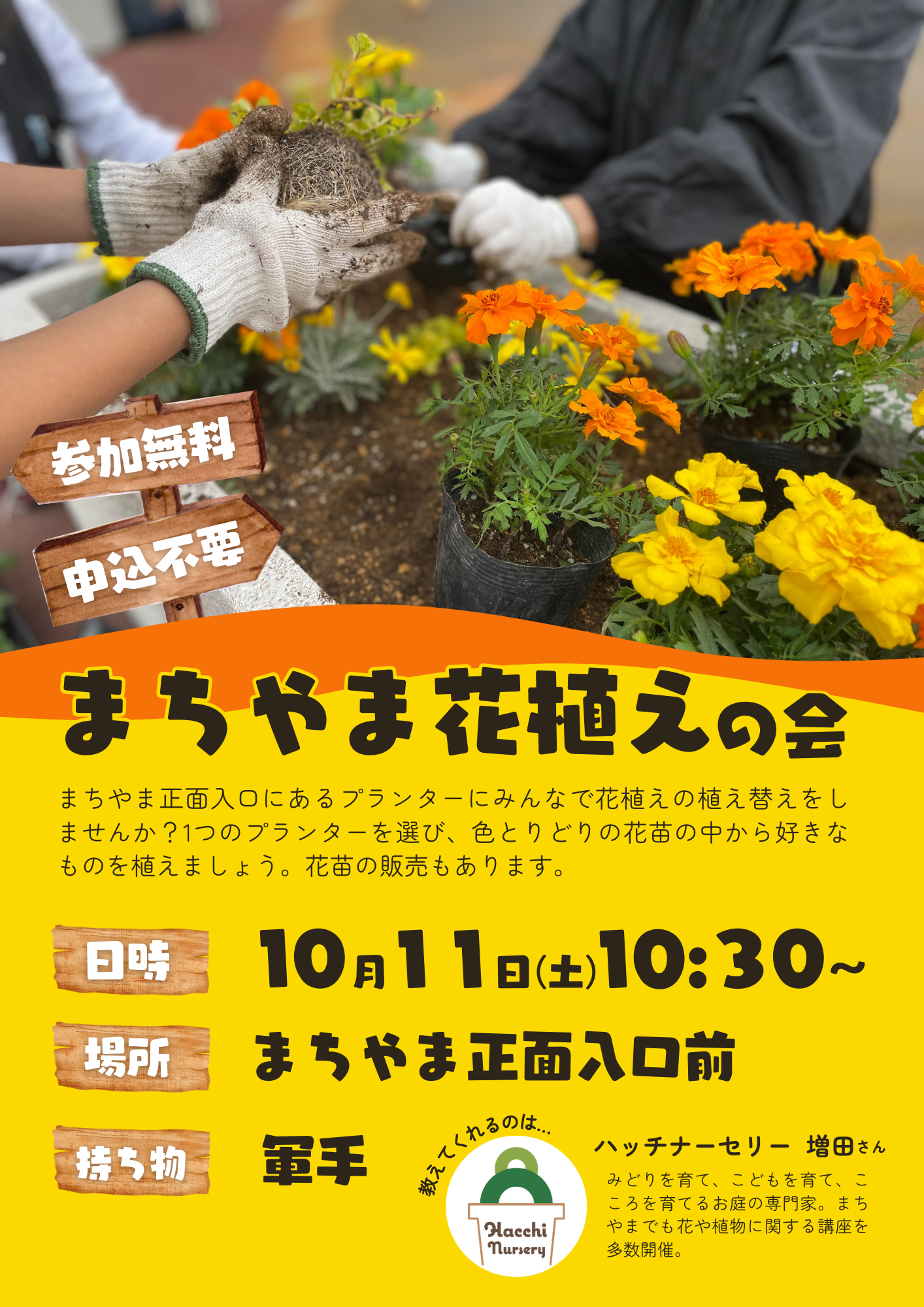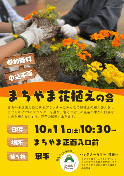 Event その他 2025年10月11日(土) まちやま花植えの会 まちやま正面入り口にあるプランターをみんなで植え替えましょう。 イベント名 まちやま花植え会 秋のプランターづくり 開催日 2025年10月11日(土) 時間 10:30~12:00 会場 まちやま正面入り口 対象 どなたでも(小学生以下は保護者同伴) 定員 なし 参加費 無料 持ち物 軍手 主催 NPO法人えんがわ 申込み方法 不要 問合せ NPO法人えんがわ(080‐9997‐3524) イベント一覧 トップにもどる 最新のイベント 2025年11月30日(日) 山本貴志エラールピアノコンサート ショパン国際ピアノコンクール第4位受賞の山本貴志氏による エラールピアノコンサートを開催します。 イベントカテゴリー 図書館 科学教育センター 鍛冶ミュージアム ステージえんがわ その他 アーカイブ 2025年11月 2025年10月 2025年9月 2025年8月 2025年7月 2025年6月 2025年5月 2025年4月 2025年3月 2025年2月 2025年1月 2024年12月 2024年11月 2024年10月 2024年9月 2024年8月 2024年7月 2024年6月 2024年5月 2024年4月 2024年3月 2024年2月 2024年1月 2023年12月 2023年11月 2023年10月 2023年9月 2023年8月 2023年7月 2023年6月 2023年5月 2023年4月 2023年3月 2023年2月 2023年1月 2022年12月 2022年11月 2022年10月 2022年9月 2022年8月 2022年7月
