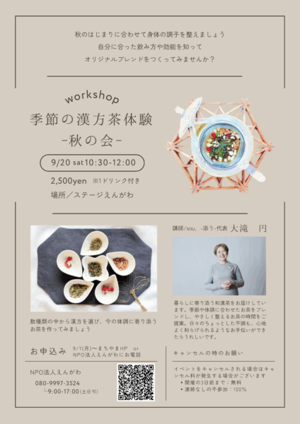 備考 | <キャンセル時のお願い> イベントをキャンセルされる場合は、キャンセル料が発生する場合がございます。お申込み前に必ずご確認ください。 〇連絡先 NPO法人えんがわ 080-9997-3524(9:00-17:00/土日可) 〇キャンセル料 ・イベント開催の3日前まで:無料 ・連絡なしの不参加:100% |
