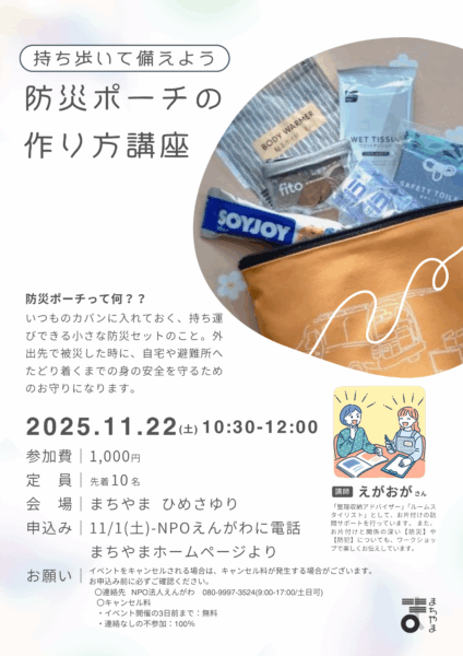 イベント名 | 持ち歩いて備えよう 防災ポーチの作り方講座 |