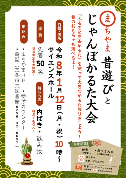 | 定員 | 【昔遊びとじゃんぼかるた大会】50人(先着) |