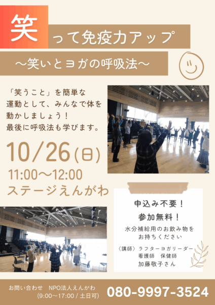 Event ステージえんがわ 2025年10月26日(日) 笑って免疫力アップ~笑いとヨガの呼吸法~ 「笑うこと」を簡単な運動として、みんなで行います。 イベント名 笑って免疫力アップ~笑いとヨガの呼吸法~ 開催日 2025年10月26日(日) 時間 11:00~12:00 会場 ステージえんがわ 参加費 無料 持ち物 水分補給用のお飲み物 主催 NPO法人えんがわ 申込み方法 事前申し込み不要、直接会場にお越しください。 問合せ NPO法人えんがわ(080-9997-3524) イベント一覧 トップにもどる 最新のイベント 2025年11月30日(日) 山本貴志エラールピアノコンサート ショパン国際ピアノコンクール第4位受賞の山本貴志氏による エラールピアノコンサートを開催します。 イベントカテゴリー 図書館 科学教育センター 鍛冶ミュージアム ステージえんがわ その他 アーカイブ 2025年11月 2025年10月 2025年9月 2025年8月 2025年7月 2025年6月 2025年5月 2025年4月 2025年3月 2025年2月 2025年1月 2024年12月 2024年11月 2024年10月 2024年9月 2024年8月 2024年7月 2024年6月 2024年5月 2024年4月 2024年3月 2024年2月 2024年1月 2023年12月 2023年11月 2023年10月 2023年9月 2023年8月 2023年7月 2023年6月 2023年5月 2023年4月 2023年3月 2023年2月 2023年1月 2022年12月 2022年11月 2022年10月 2022年9月 2022年8月 2022年7月