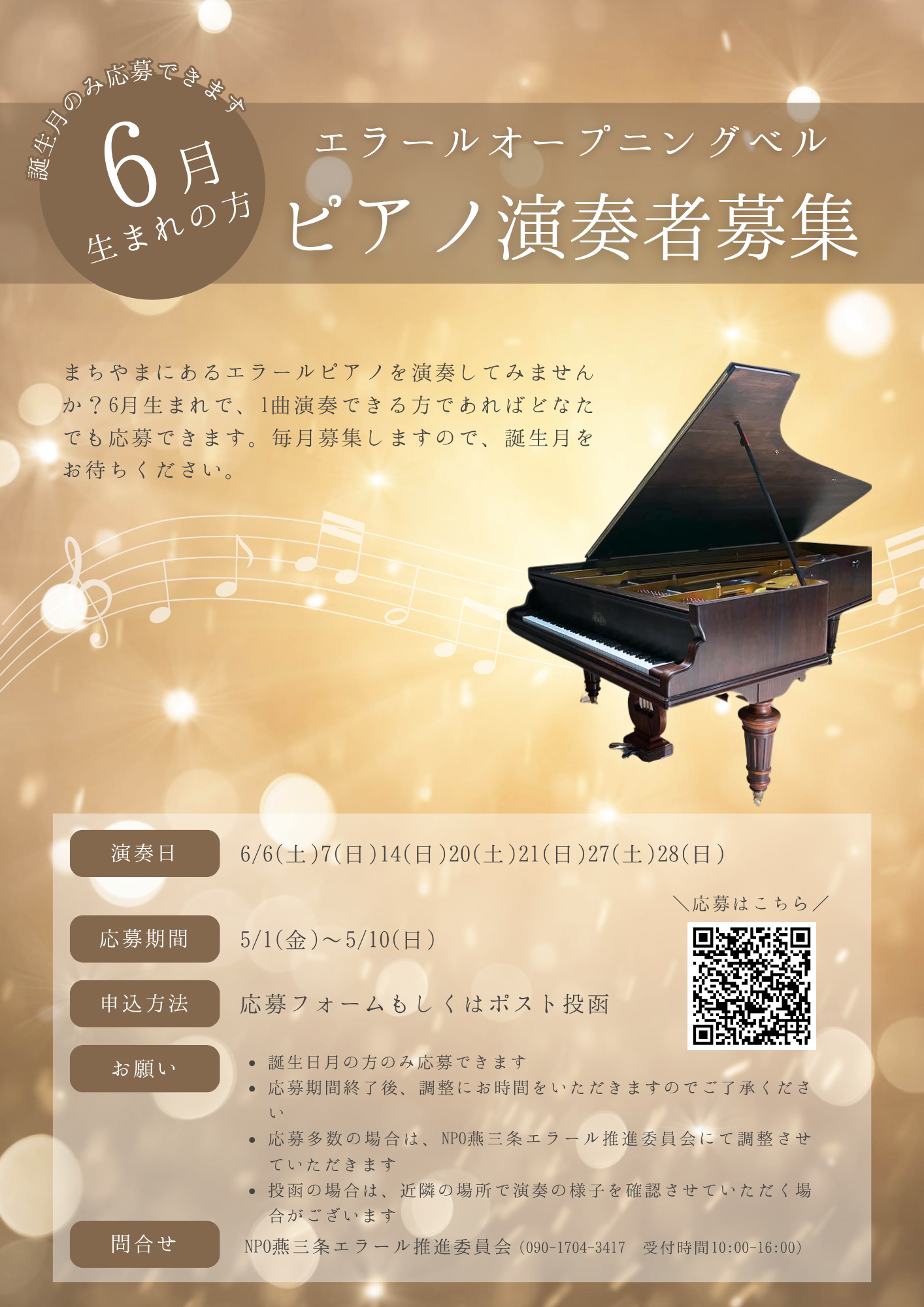 | 備考 | ・誕生日月の方のみ応募できます ・ご応募いただいた後、調整にお時間をいただきますのでご了承ください ・応募多数の場合は、NPO燕三条エラール推進委員会にて調整させていただきます ・投函の場合は、近隣の場所で演奏の様子を確認させていただく場合がございます |