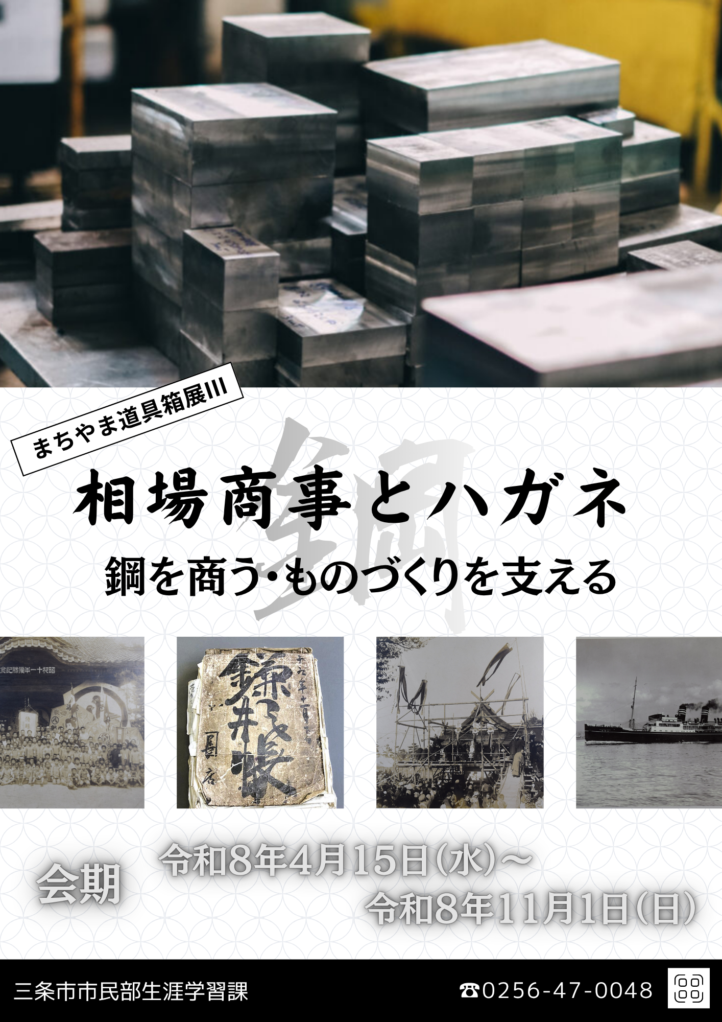 Event イベントアーカイブ 2026年1月17日(土) 【満席】護身ワークショップ 2026年1月16日(金) つくってポン! 2026年3月14日(土) 【終了しました】プラネタリウム上映会「消されたかわいそうな星座たち」 2026年2月28日(土) 【終了しました】サイエンスショー「不思議な科学~あたりまえのようで、あたりまえじゃない~」 2026年1月16日(金) 本とコーヒーとカリンバと 20 / 241« 先頭«...10...1819202122...304050...»最後 » イベント一覧 トップにもどる 最新のイベント 2026年04月15日 まちやま道具箱展Ⅲ 「相場商事とハガネ 鋼を商う・ものづくりを支える」 三条市は金属加工業を中心に「ものづくりのまち」として発展してきました。 メーカーが金属製品を製造するためには、原材料である鉄・鋼の供給が欠かせません。 イベントカテゴリー 図書館 科学教育センター 鍛冶ミュージアム ステージえんがわ その他 アーカイブ 2026年5月 2026年4月 2026年3月 2026年2月 2026年1月 2025年12月 2025年11月 2025年10月 2025年9月 2025年8月 2025年7月 2025年6月 2025年5月 2025年4月 2025年3月 2025年2月 2025年1月 2024年12月 2024年11月 2024年10月 2024年9月 2024年8月 2024年7月 2024年6月 2024年5月 2024年4月 2024年3月 2024年2月 2024年1月 2023年12月 2023年11月 2023年10月 2023年9月 2023年8月 2023年7月 2023年6月 2023年5月 2023年4月 2023年3月 2023年2月 2023年1月 2022年12月 2022年11月 2022年10月 2022年9月 2022年8月 2022年7月