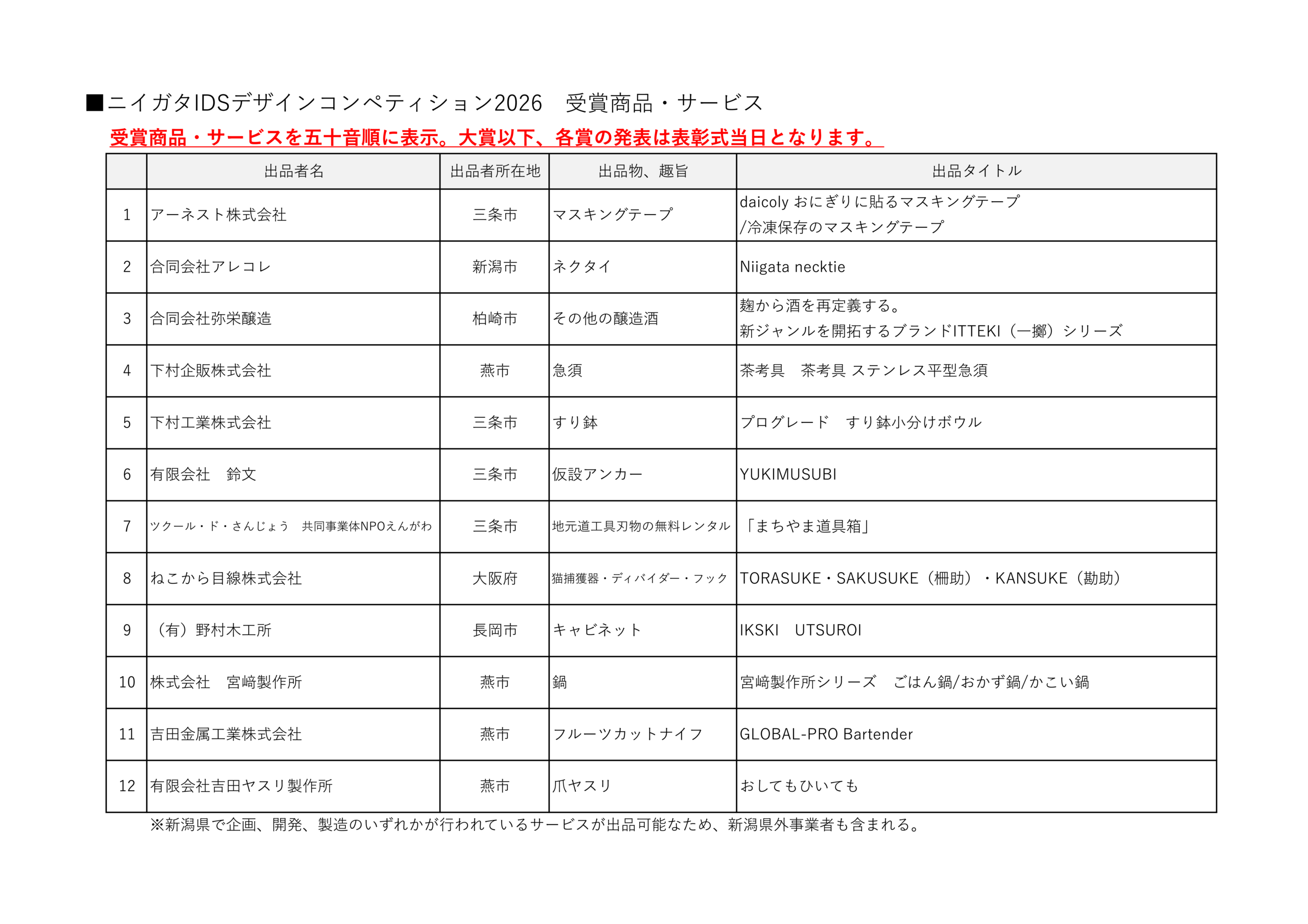 新潟県知事賞、新潟日報社賞 など、各商品の受賞タイトルにつきましては、3月 10 日(火)14:00 から、新潟日報メディアシップ2階日報ホールにて開催される表彰式にて発表となります。