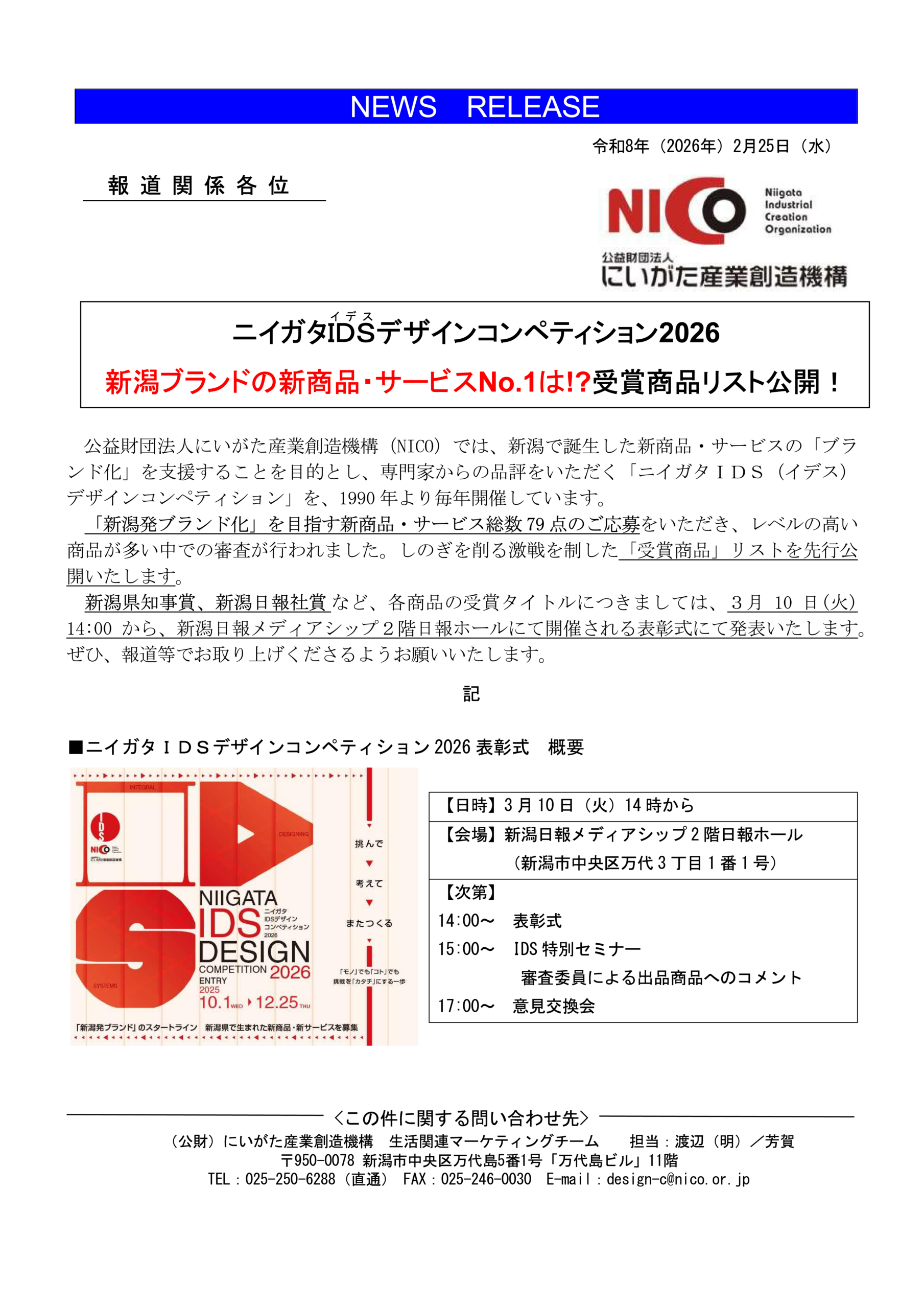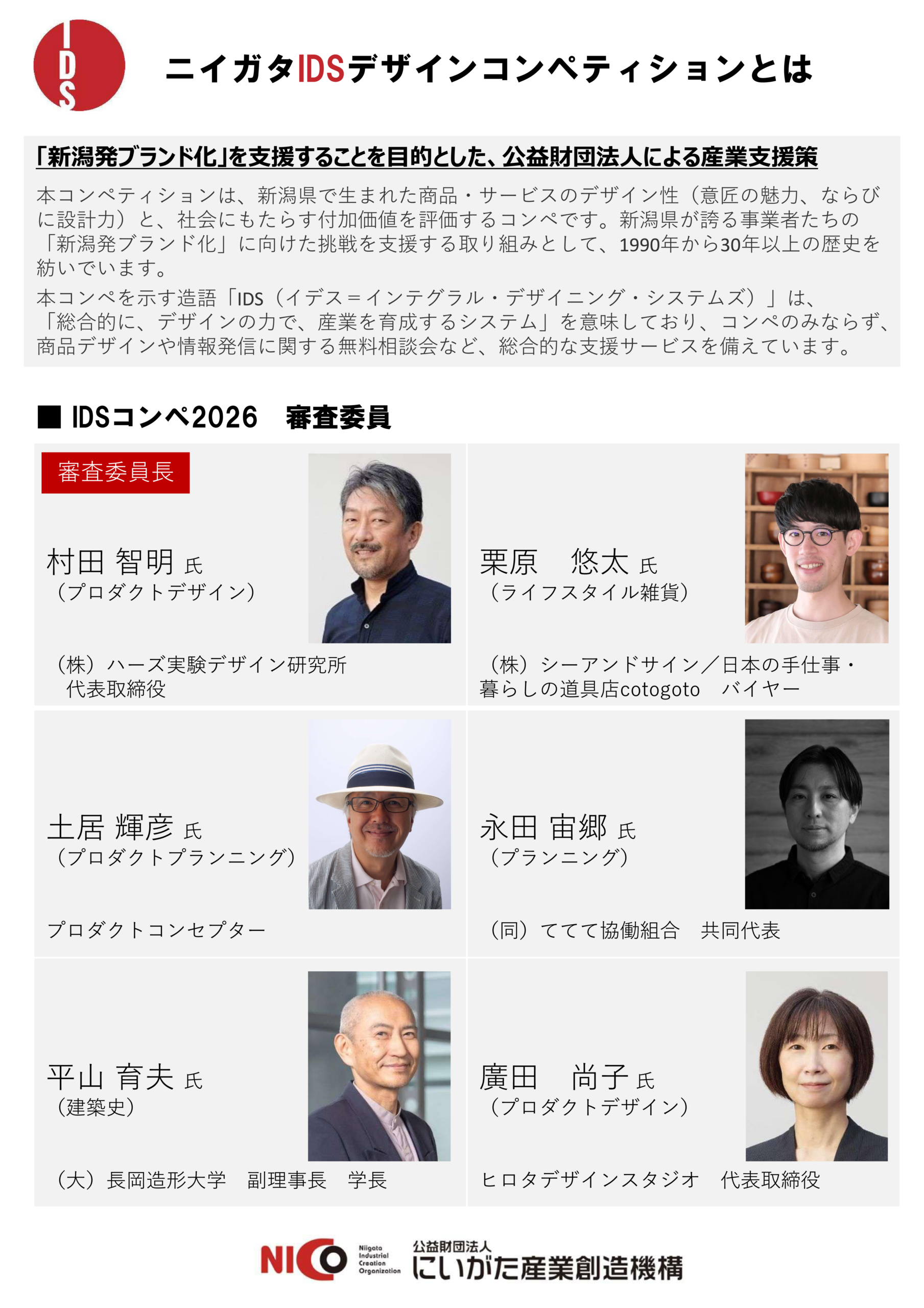 公益財団法人にいがた産業創造機構(NICO)では、新潟で誕生した新商品・サービスの「ブランド化」を支援することを目的とし、専門家からの品評をいただく「ニイガタIDS(イデス)デザインコンペティション」を、1990 年より毎年開催しています。