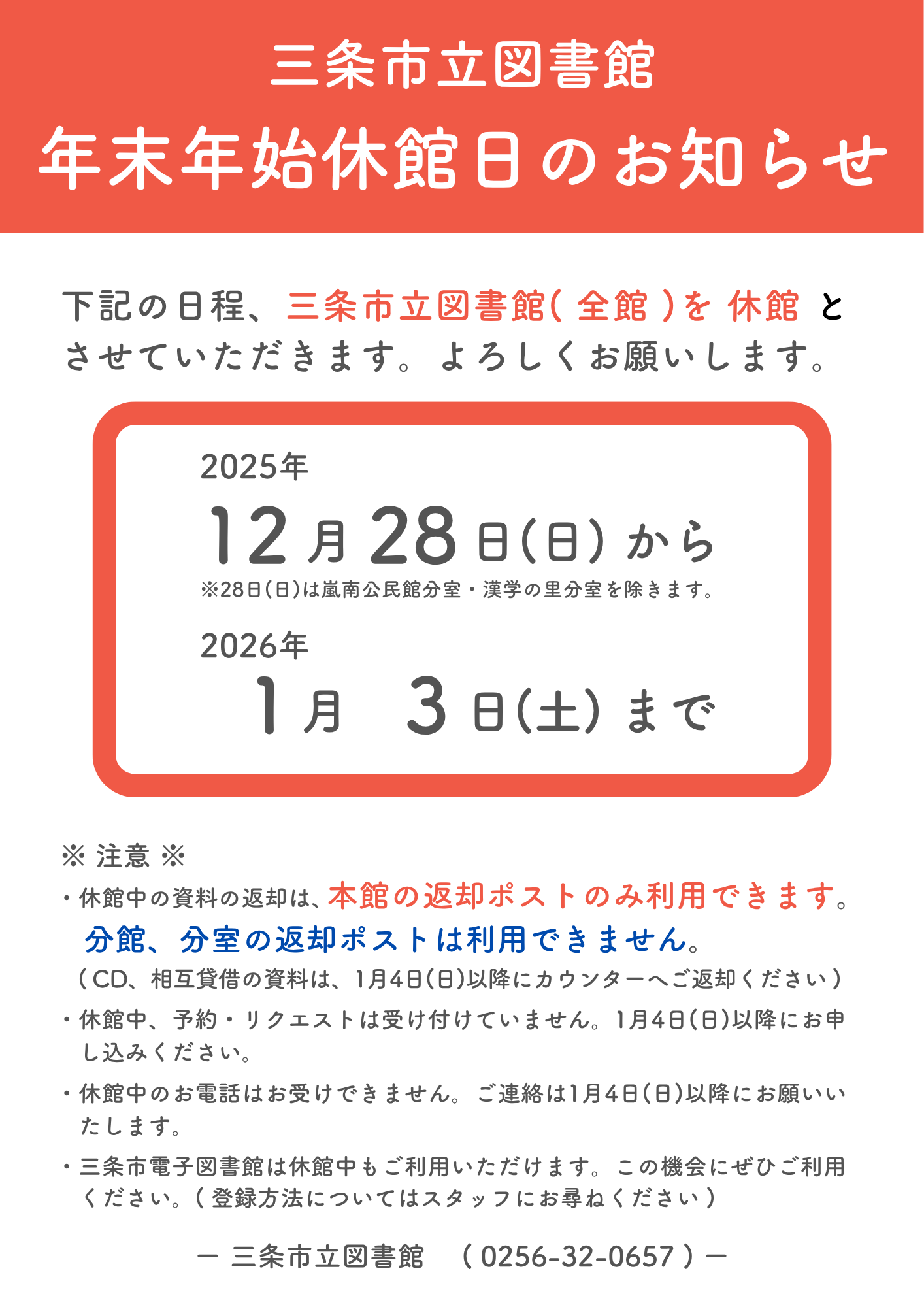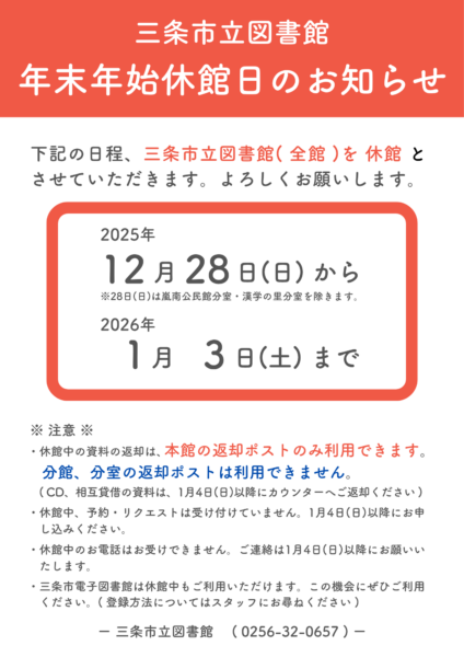 Information 2025年12月18日 12月28日(日)から1月3日(土)までの間、年末年始のため三条市立図書館全館を休館とさせていただきます。 ※28日(日)は嵐南公民館分室・漢学の里分室を除きます。 休館中のお電話はお受けできません。 予約・リクエストはお電話とHPのどちらもお受けできません。 大変ご迷惑をおかけしますが、よろしくお願いいたします。 お知らせ一覧 トップにもどる アーカイブ 2025年12月 2025年11月 2025年10月 2025年9月 2025年8月 2025年7月 2025年6月 2025年5月 2025年4月 2025年3月 2025年2月 2025年1月 2024年12月 2024年11月 2024年10月 2024年9月 2024年8月 2024年7月 2024年6月 2024年5月 2024年4月 2024年3月 2024年2月 2024年1月 2023年12月 2023年11月 2023年10月 2023年9月 2023年8月 2023年7月 2023年6月 2023年5月 2023年4月 2023年3月 2023年2月 2023年1月 2022年12月 2022年11月 2022年10月 2022年9月 2022年8月 2022年7月 2022年6月