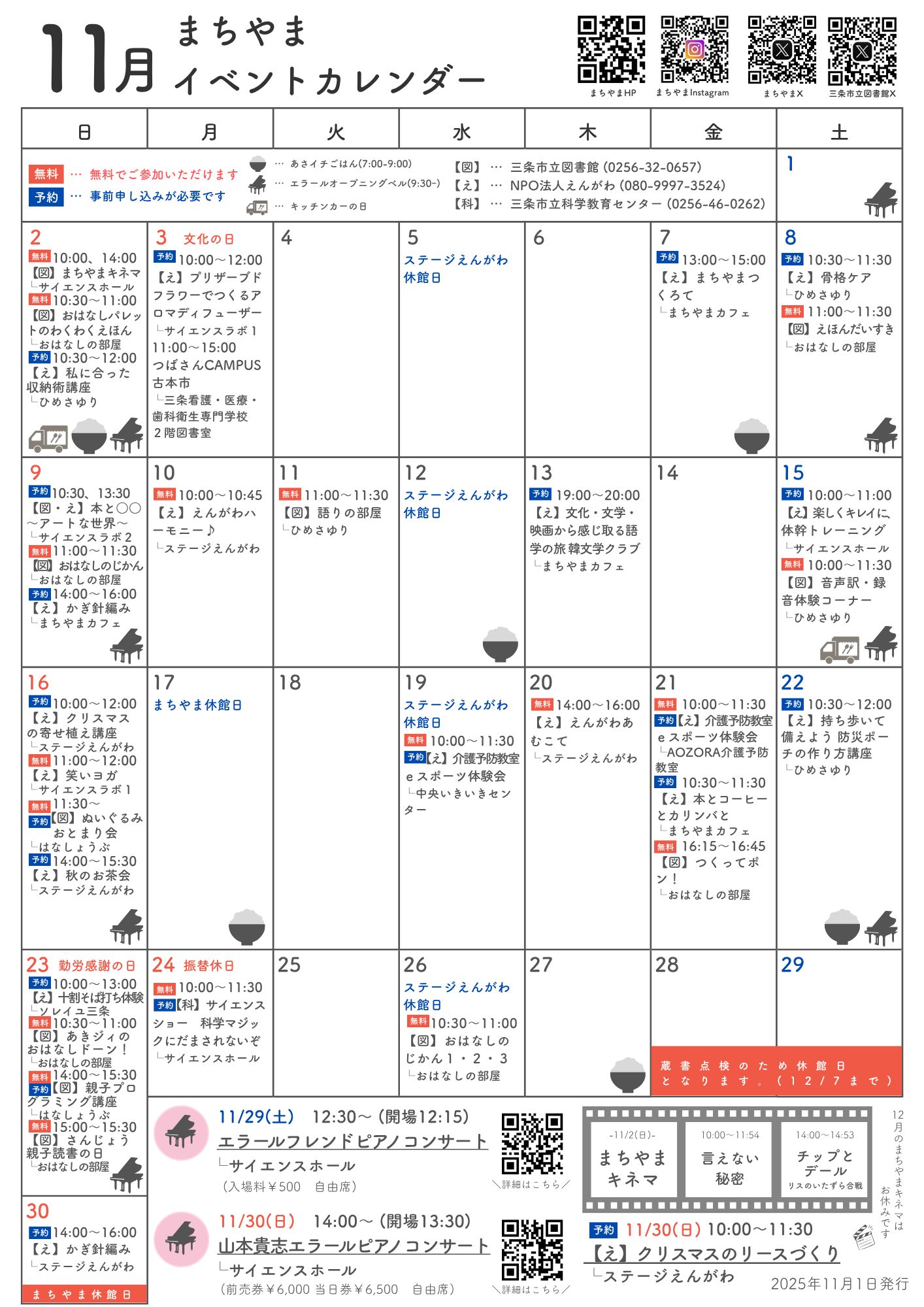 Information 2025年10月23日 11月のまちやまイベント情報です。 各イベントの詳細はHPのイベントページ、または二次元コードからご確認ください。 ぜひ、ご参加お待ちしております。 お知らせ一覧 トップにもどる アーカイブ 2025年10月 2025年9月 2025年8月 2025年7月 2025年6月 2025年5月 2025年4月 2025年3月 2025年2月 2025年1月 2024年12月 2024年11月 2024年10月 2024年9月 2024年8月 2024年7月 2024年6月 2024年5月 2024年4月 2024年3月 2024年2月 2024年1月 2023年12月 2023年11月 2023年10月 2023年9月 2023年8月 2023年7月 2023年6月 2023年5月 2023年4月 2023年3月 2023年2月 2023年1月 2022年12月 2022年11月 2022年10月 2022年9月 2022年8月 2022年7月 2022年6月