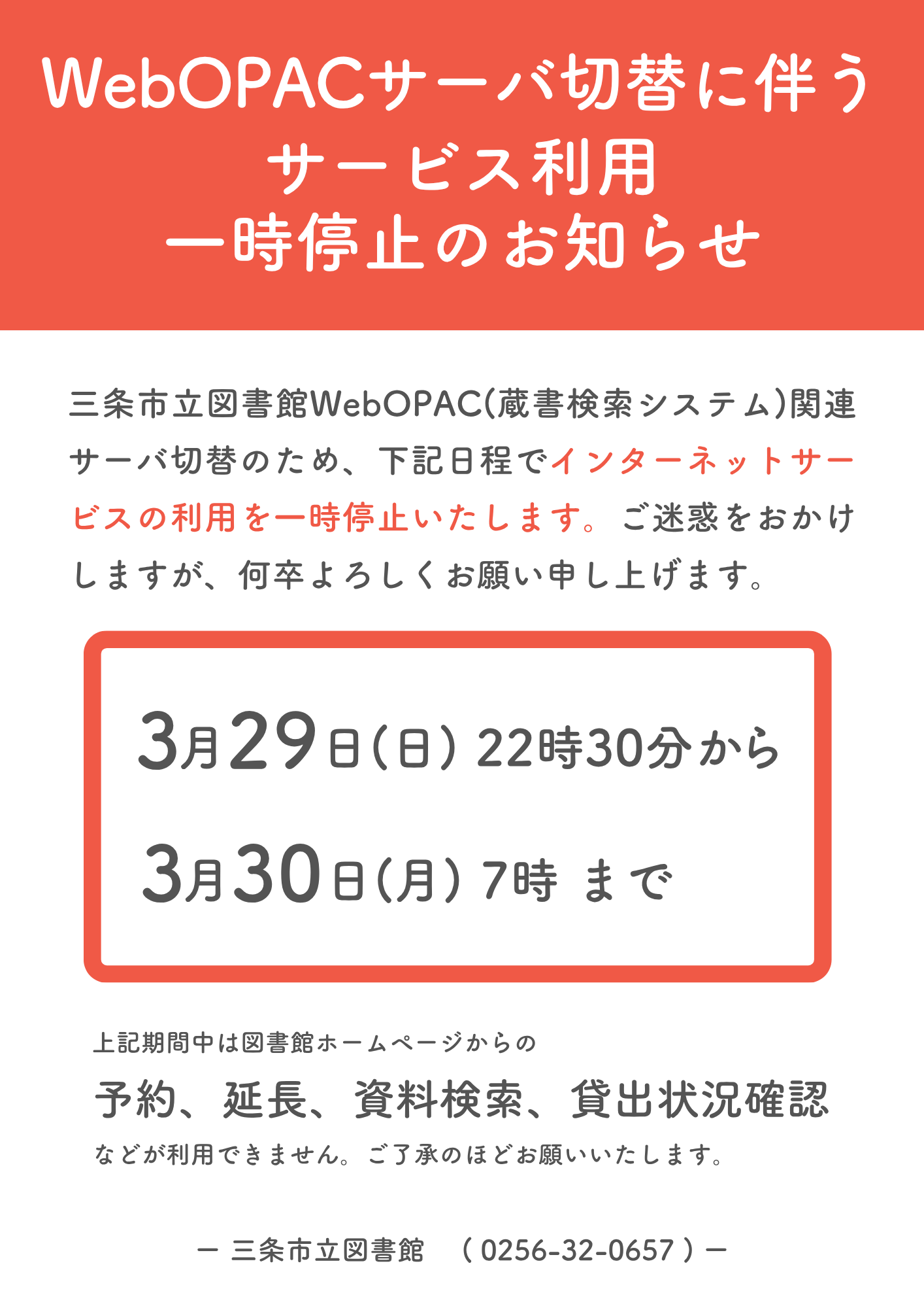 3月29日(日)22時30分~30日(月)7時頃まで、WebOPAC(蔵書検索システム)サーバ切替作業につき