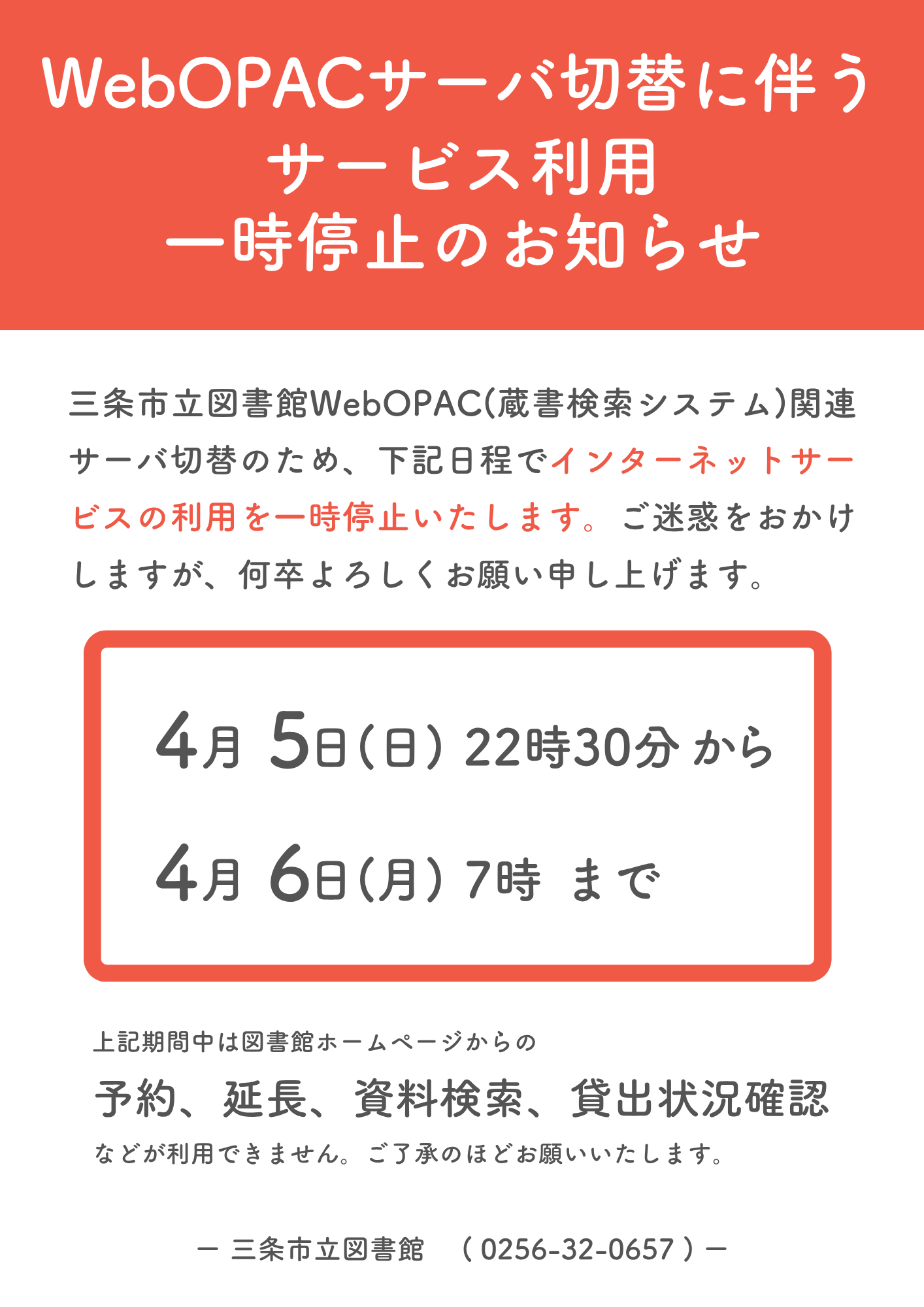 Information 2026年03月31日 4月5日(日)22時30分~6日(月)7時頃まで、WebOPAC(蔵書検索システム)サーバ切替作業につき ホームページからの予約・延長・資料検索・貸出状況確認が利用できません。 ご不便をおかけいたしますが、ご理解のほどよろしくお願いいたします。 お知らせ一覧 トップにもどる アーカイブ 2026年3月 2026年2月 2026年1月 2025年12月 2025年11月 2025年10月 2025年9月 2025年8月 2025年7月 2025年6月 2025年5月 2025年4月 2025年3月 2025年2月 2025年1月 2024年12月 2024年11月 2024年10月 2024年9月 2024年8月 2024年7月 2024年6月 2024年5月 2024年4月 2024年3月 2024年2月 2024年1月 2023年12月 2023年11月 2023年10月 2023年9月 2023年8月 2023年7月 2023年6月 2023年5月 2023年4月 2023年3月 2023年2月 2023年1月 2022年12月 2022年11月 2022年10月 2022年9月 2022年8月 2022年7月 2022年6月